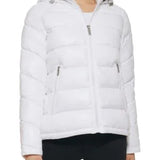 Warm and comfy puffer jacket with attached hood and conventional stand collar.