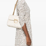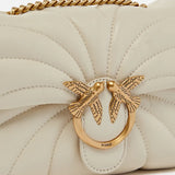 Mini Love Bag Puff small soft crossbody bag in nappa leather with quilting shaped in the characteristic outline of butterfly wings. The sliding metal chain strap with nappa leather shoulder pad can be doubled over to wear the bag on the shoulder. The flap closure is embellished with the iconic antique gold-electroplated metal Love Birds Diamond Cut buckle. The accessory boasts a microsuede-lined interior, complete with a zipped centre divider pocket and an internal pocket for better space management. Activate your PINKO bag: verify the authenticity of your product and access a personalised experience by scanning the Love Birds embroidery on the back of the bag with your smartphone!