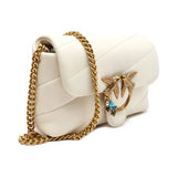 Bag made of quilted nappa leather. Flap and button closure. Iconic Love Birds buckle detail embellished with crystals. Chain shoulder strap. Single compartment. Inside zipper pocket. Ivory
