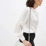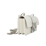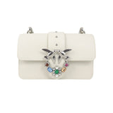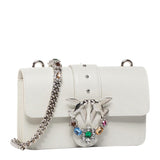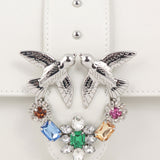 This leather Love Birds buckle bag features crystal embellishments on the front flap, magnetic closure, studded accents, chain shoulder strap and an internal zip pocket.