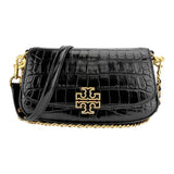 The Tory Burch Britten crossbody bag is a stunning accessory that beautifully combines clean, structured lines with bold sculptural hardware accents. It is crafted from croc-embossed leather with meticulous hand-painted edges, showcasing a high level of craftsmanship and attention to detail.