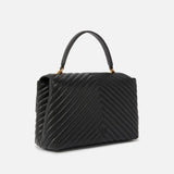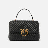 Big Love Bag Puff in quilted nappa leather with chevron pattern. The fastening is embellished with the iconic metal Love Birds Diamond Cut buckle. The accessory boasts a microsuede-lined interior, complete with a zipped centre divider pocket and slip pocket. The shoulder strap combines the classic round metal chain with a practical, adjustable nappa leather pad.