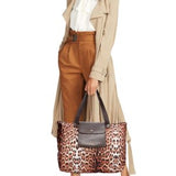 Keep your thing handy with this stylish tote featuring leopard print.