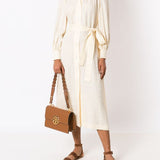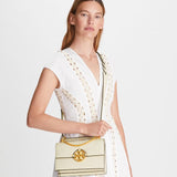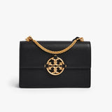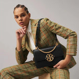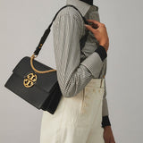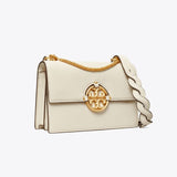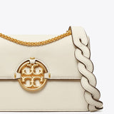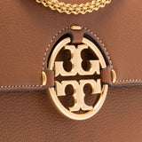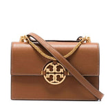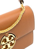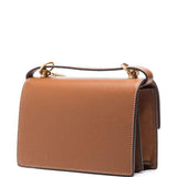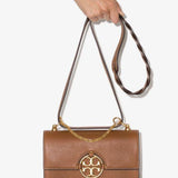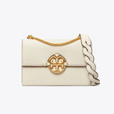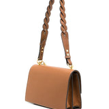 Tory Burch showcases their exquisite craftsmanship when it comes to accessories. As seen by this leather bag, it's highlighted by an intricately braided top handle and caramel leather construction