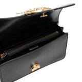 jet black calf leather gold-tone hardware gold-tone logo plaque detachable leather and chain-link shoulder strap foldover top with magnetic fastening partitioned compartment internal zip-fastening pocket